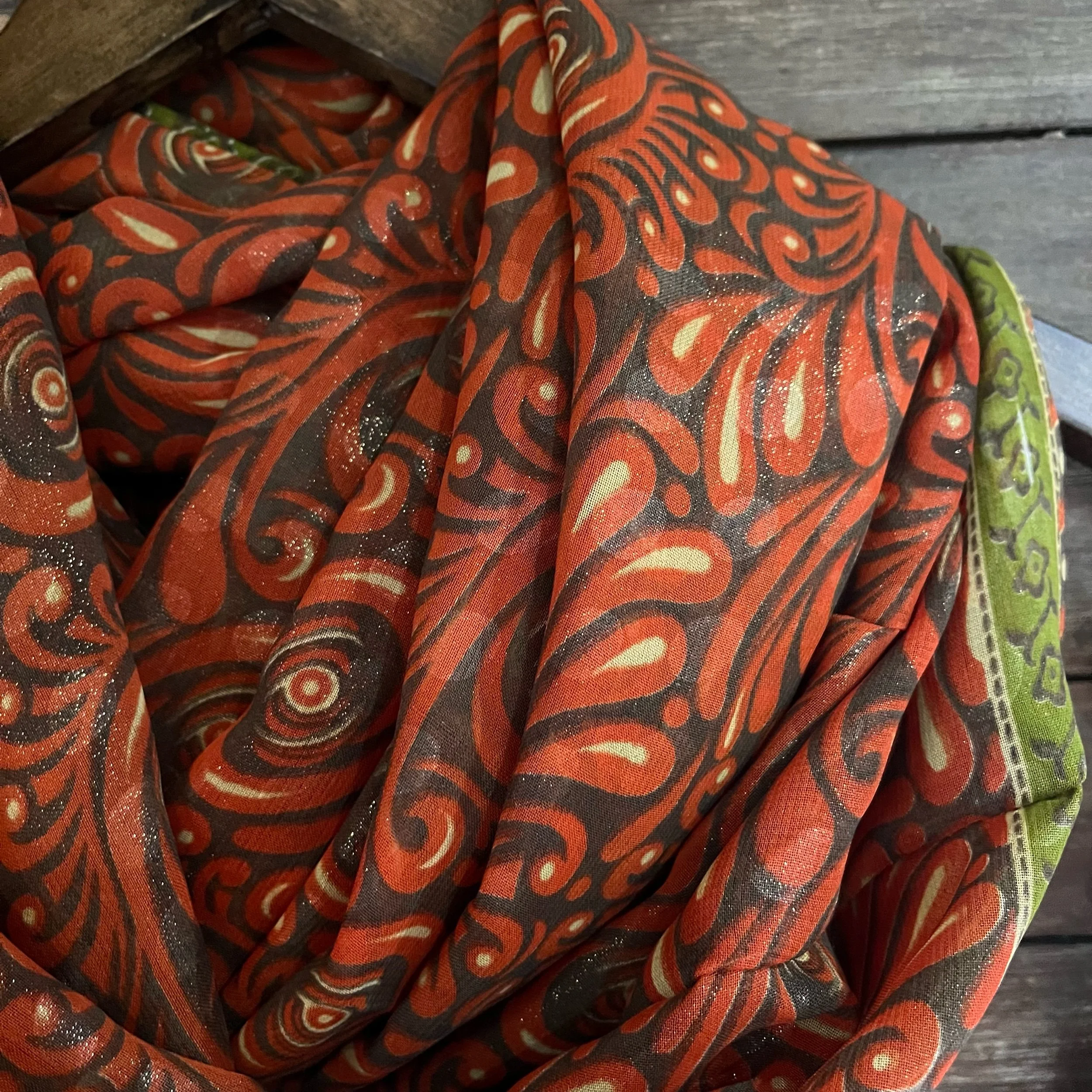 snood scarf ~ handmade on our narrowboat from recycled sari