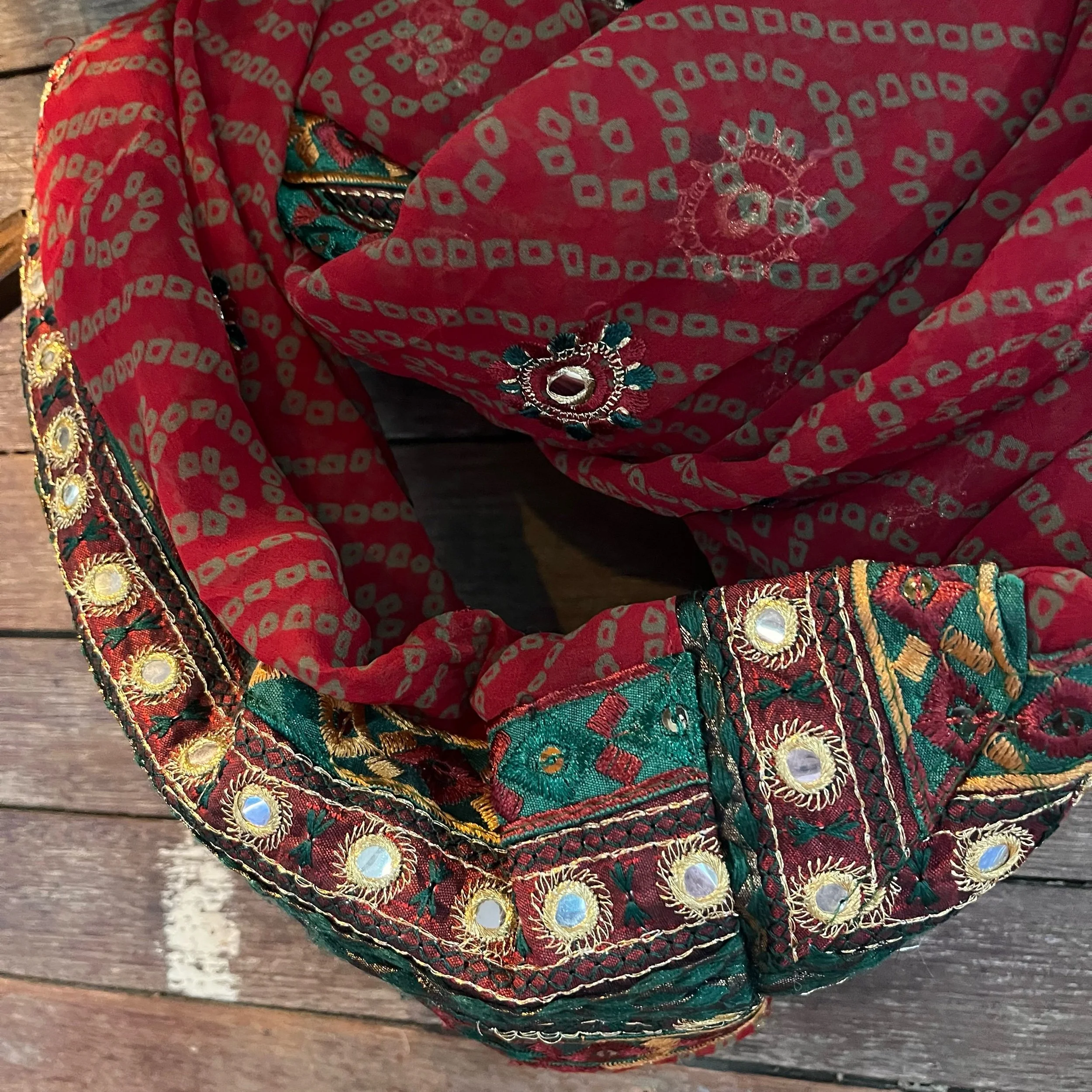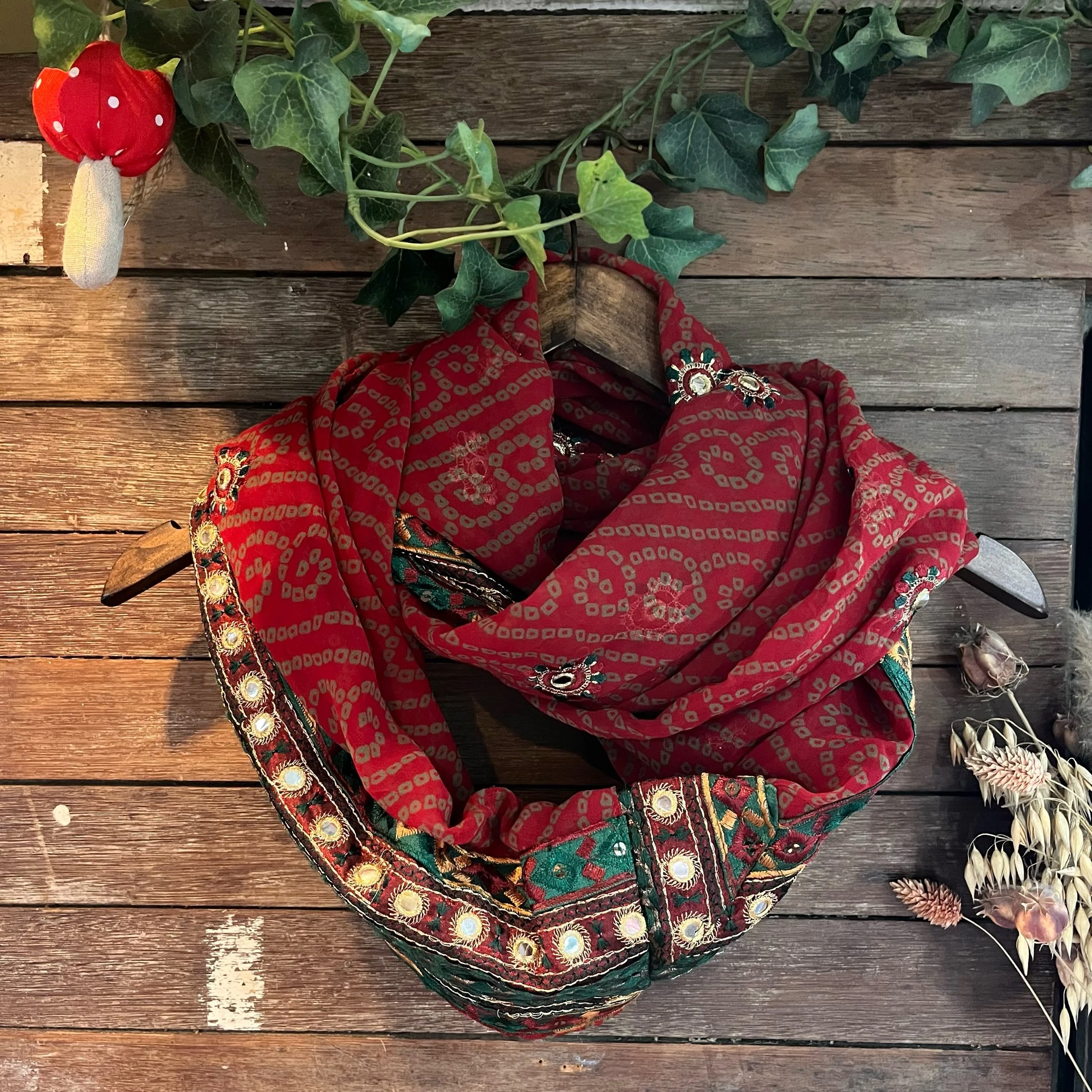 snood scarf ~ handmade on our narrowboat from recycled sari