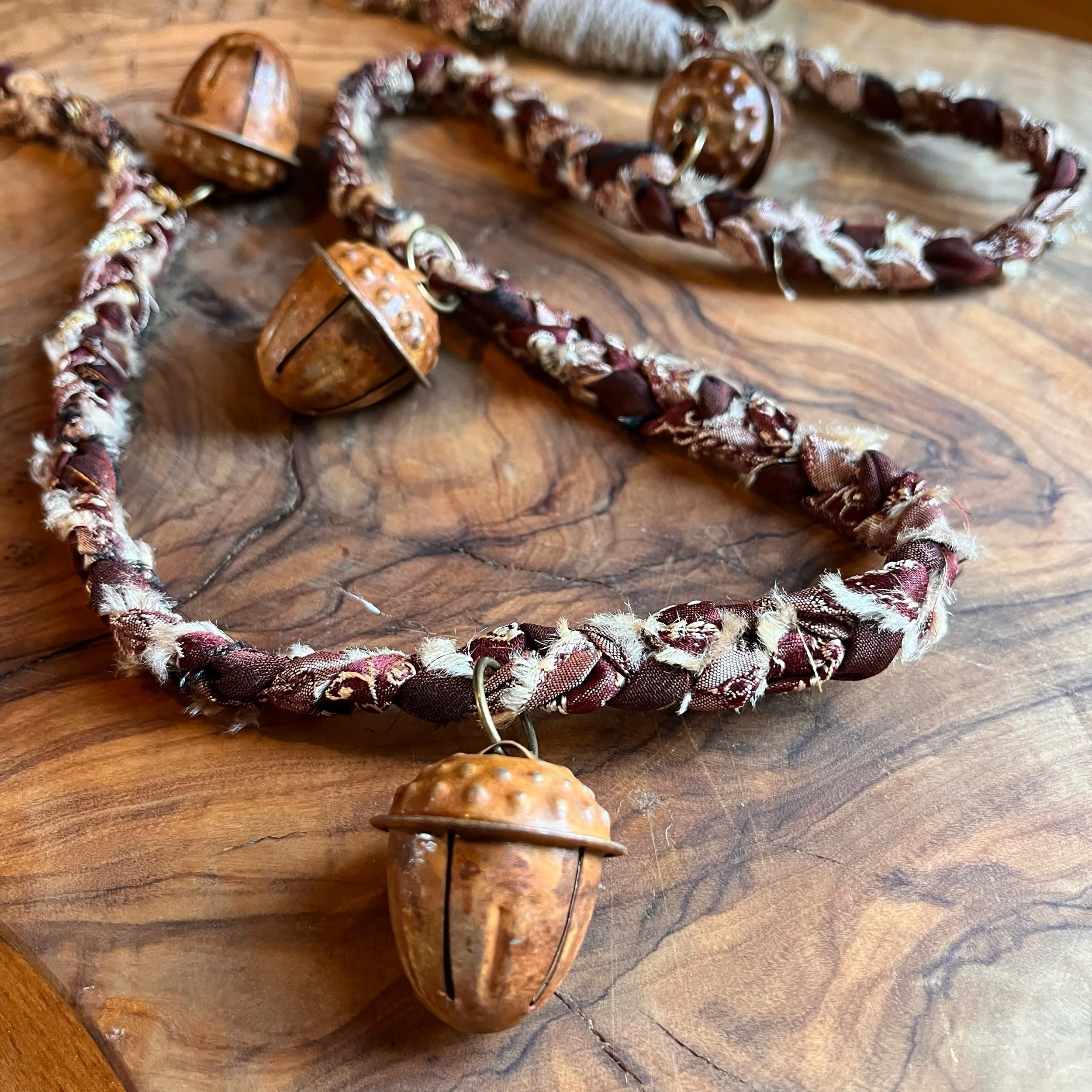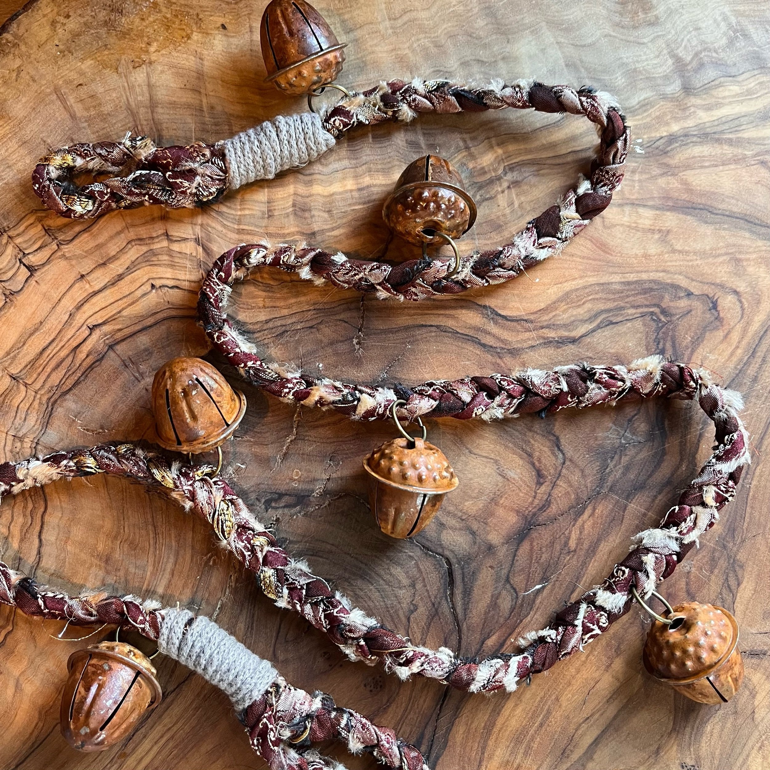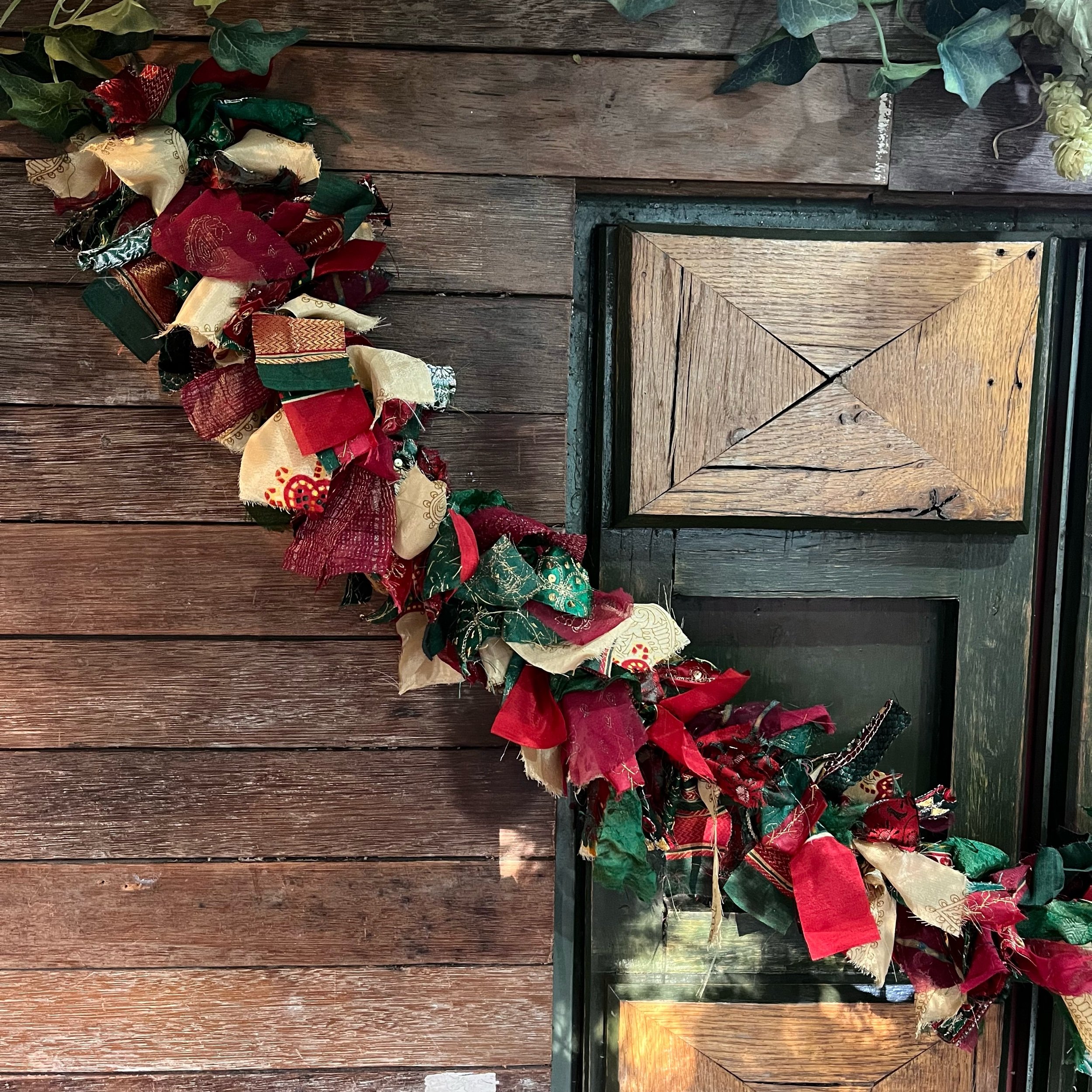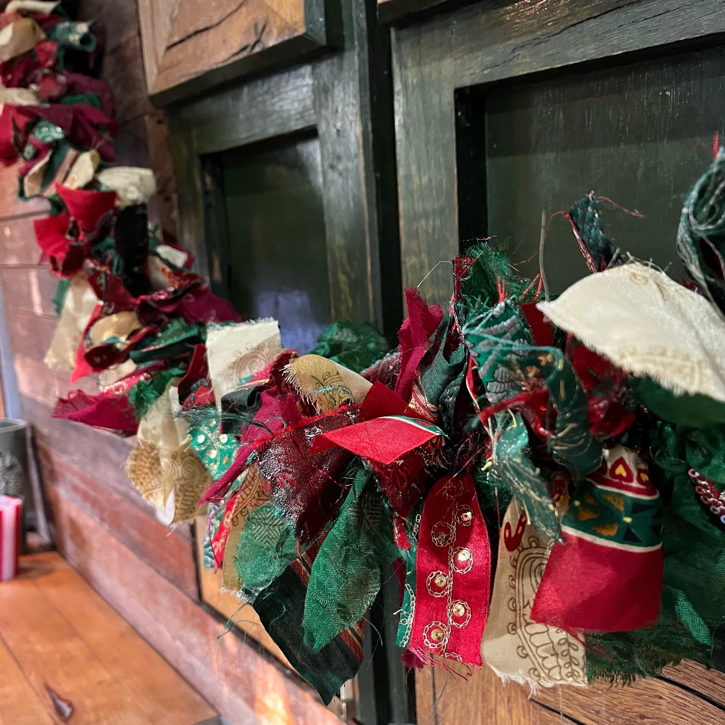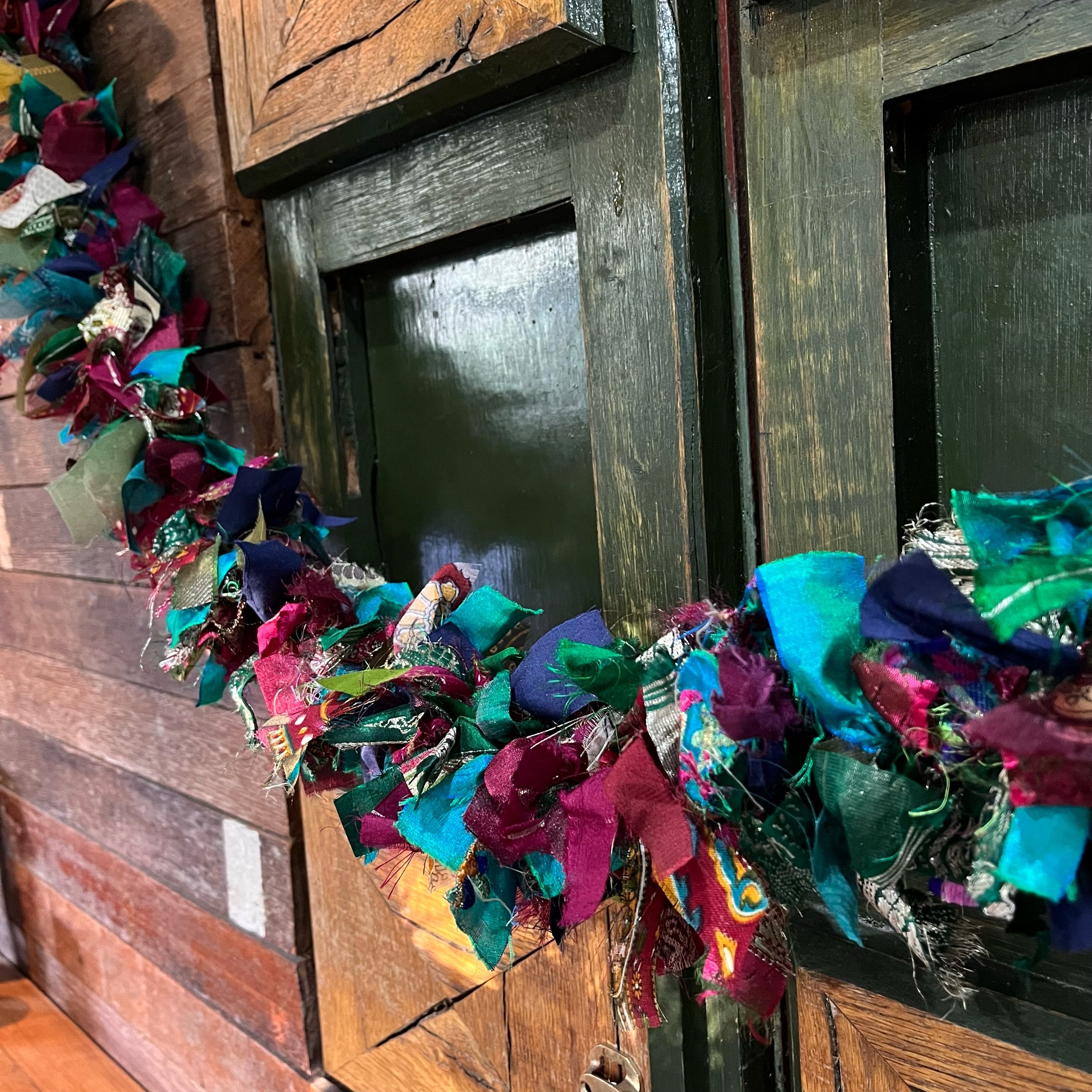 Handmade Christmas wreath made from recycled sari scraps in beautiful Yuletide colours
